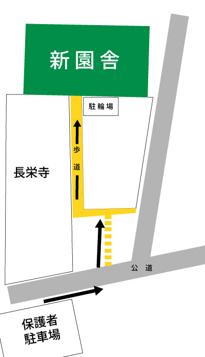 令和8年4月より、新園舎へ移行します。出入口の場所が変わっていますので、下記「駐車場について」の図を確認していただき、お間違えのないようにお願いいたします。※GoogleMap等の反映には時間がかかります。
